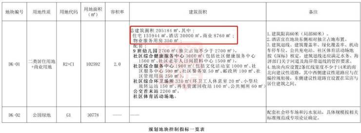 用地面积102592㎡,规划用地性质为二类居住用地+商业用地(R2+C1),容积率为2.0,总建筑面积205184㎡,其中:住宅155944㎡,酒店30000㎡(宜在地块东侧相对独立占地),商业8760㎡,物业服务用房350㎡,配套:9班幼儿园2700㎡(独立占地不少于2700㎡),社区综合健康服务中心3000㎡(包括社区健康服务中心1500㎡、社区老年人日间照料中心1500㎡),社区综合服务中心1900㎡(包括文化活动室1000㎡、社区服务中心500㎡、社区警务室50㎡、邮政所100㎡、社区管理用房250㎡),社区综合环卫场所330㎡(环卫工人休息室20㎡、小型垃圾转运站150㎡、再生资源回收站100㎡、公共厕所60㎡),公交首末站2200㎡,社区体育活动场地。