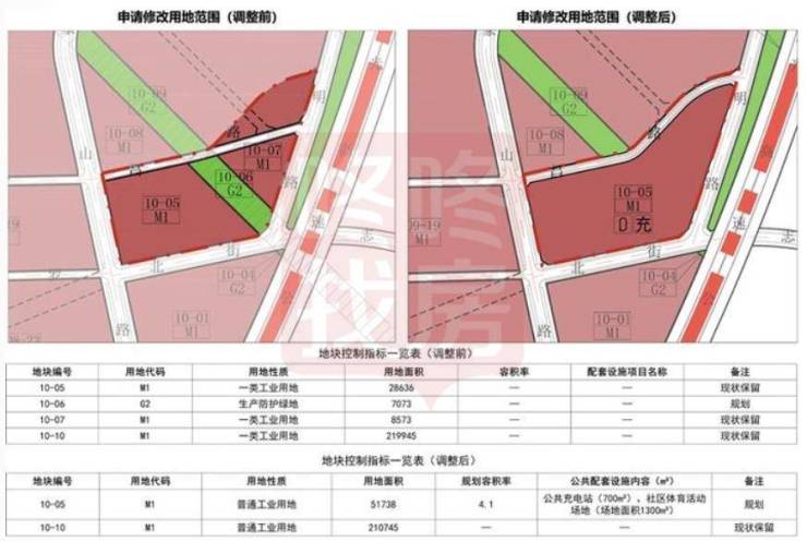 (一)重新划分10-05、10-06、10-07、10-10地块范围:其中取消10-06地块生产防护绿地7073平方米,将10-05、10-06、10-07及部分10-10地块合并为10-05地块,合并后10-05地块面积为51738平方米,用地性质由“一类工业用地”调整为“普通工业用地”,规划容积率由“—”调整为“4.1”,公共配套设施由法定图则“—”调整为“公共充电站(700平方米)、社区体育活动场地(场地面积1300平方米)”,备注“规划”,其余指标不变;