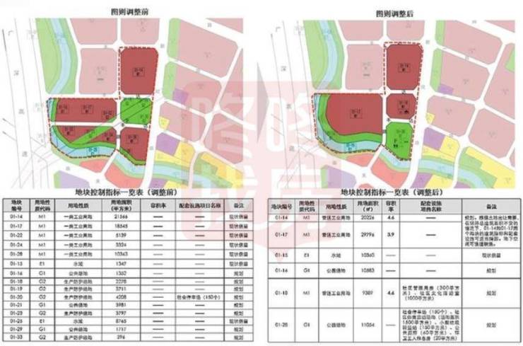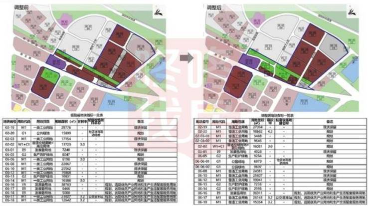 2. 02-20地块用地面积由15899平方米调整为18582平方米,规划用地性质由公共绿地调整为普通工业用地,容积率由“-”调整为“4.2”,配套设施项目由“社区体育活动场地”调整为“-”,备注为“规划”。