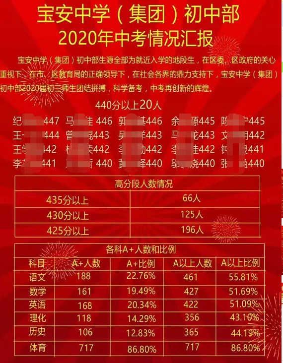 宝安区:宝安实验学校较高分448分,区公办排名前列名