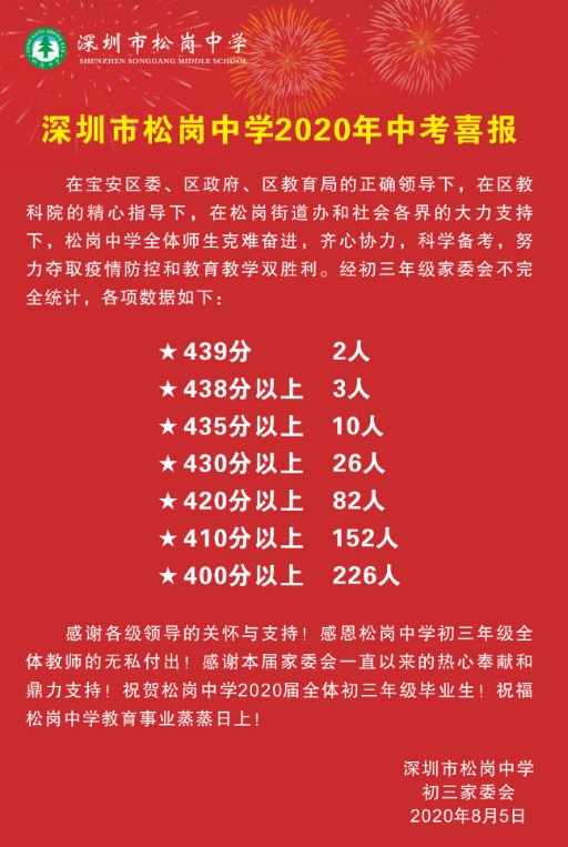 松岗中学:435分以上10人;430分以上26人;420分以上82人;410分以上152人;400分以上226人。