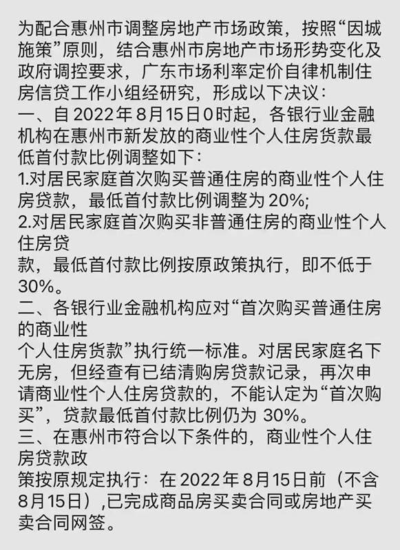 一、自2022年8月15日0时起,各银行业金融机构在惠州市新发放的商业性个人住房货款较低首付款比例调整如下: