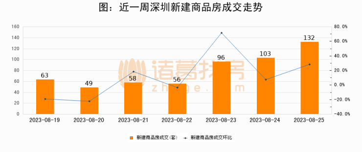 根据深圳市住房和城乡建设局数据显示,2023年08月25日深圳新建商品房成交132套,较昨日增加29套,环比上涨28.2%