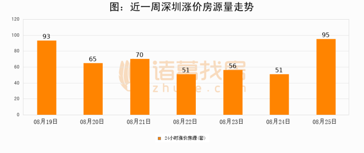 根据诸葛找房数据显示,深圳24小时涨价房源量为95套,较08月24日增加44套,环比上涨86.3%。与此同时,涨价房源占比小幅扩大,业主信心有所提升。