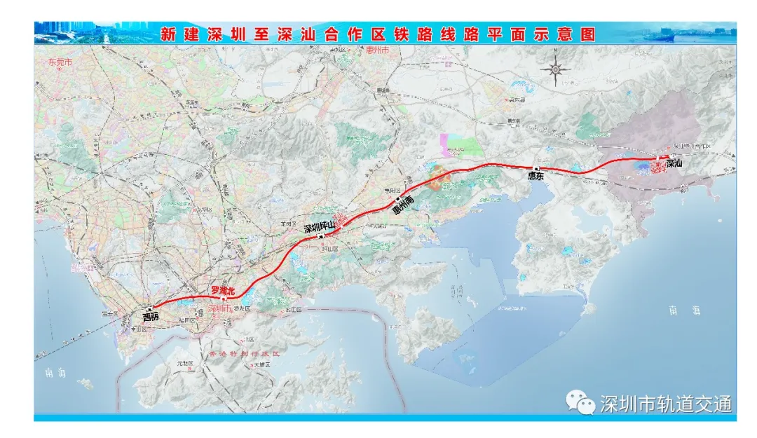 其中,深圳段约55.36公里,惠州段约56.99公里,深汕合作区段约17.03公里,全线设西丽、罗湖北、深圳坪山、惠州南、惠东、深汕6座车站。预计2025年建成开通
