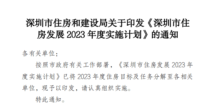 据5月9日深圳住建局发布的《深圳市住 房发展 2023 年度实施计划》显示: