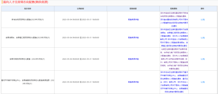 首先是5月4日,包括深铁熙府、星河开市客、新城华苑在内的8个可售人才房项目、2403套房源,启动常态化配售。