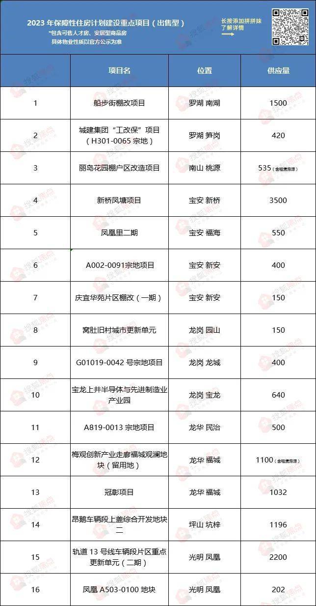 罗湖船步街棚改项目(1500套)、宝安的新桥凤塘项目(3500套)、龙华的冠彰项目(1196套)、坪山的昂鹅车辆段上盖综合开发地块二(1196套)、光明的轨道 13 号线车辆段片区重点更新单元(二期)(2200套)等项目。