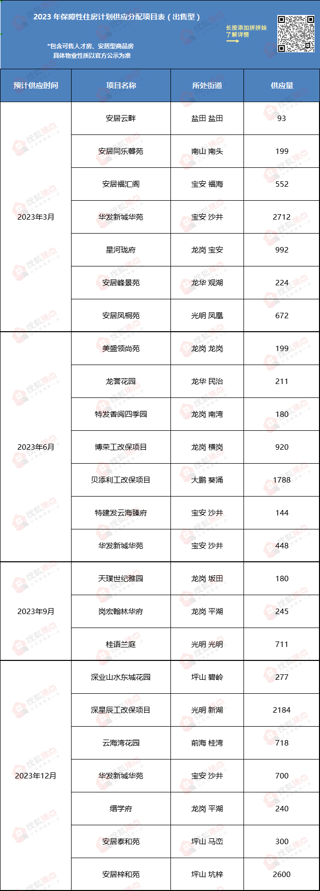 9月(三季度)计划供应3个出售型保障房;包括龙岗坂田的天璞世纪雅园、龙岗平湖的岗宏翰林华府、光明中心的桂语兰庭;