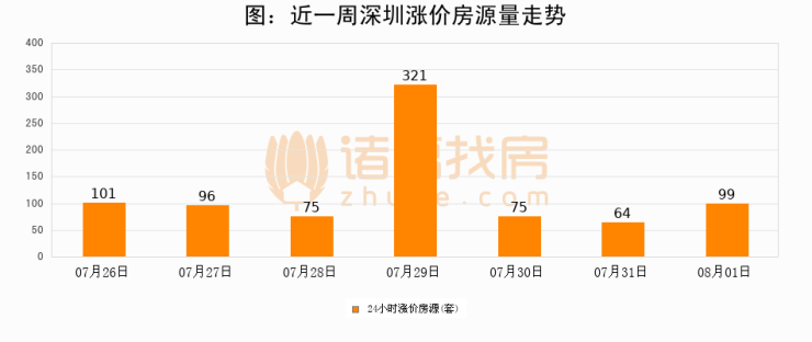 根据诸葛找房数据显示,深圳24小时涨价房源量为99套,较07月31日增加35套,环比上涨54.7%。与此同时,涨价房源占比小幅扩大,业主信心有所提升。