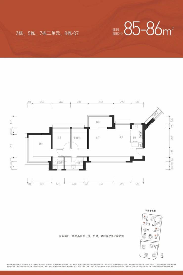 8种85㎡及以内的3房1.5-2卫(带2个马桶位)户型。