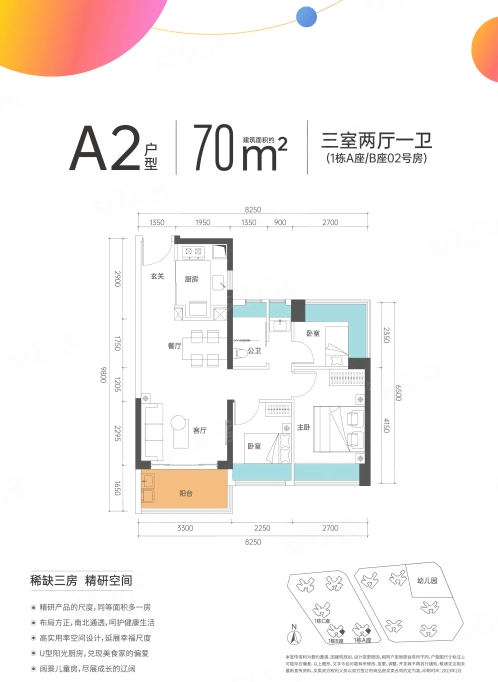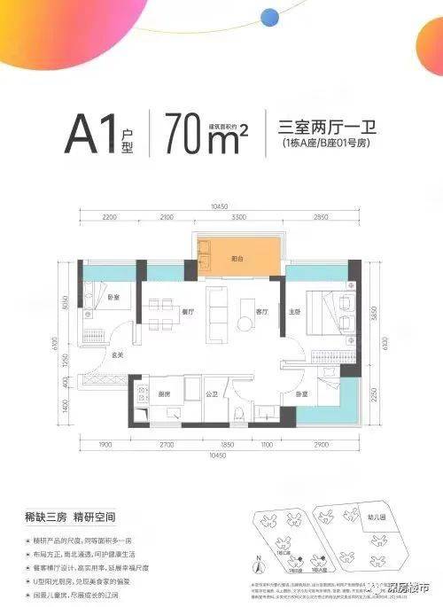 传承启元府是今年入市的新房中,最小面积的3房,仅70㎡,其中A1户型还是横厅设计,户型可以说是相当“炸裂”了。