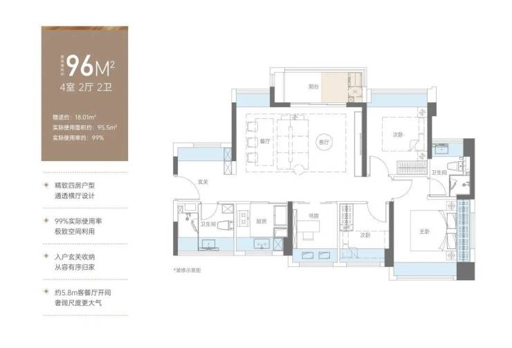 美盛领尚苑主打一个“高实用率”,建面约96㎡户型可以做到四房,虽然项目已经开盘,但线上暂未看到带尺寸的户型图,可以通过项目官方公公示的数据做参考。