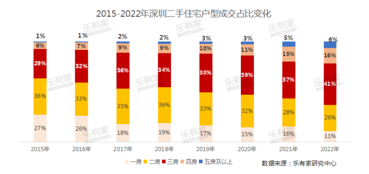 一组是乐有家发布的近7年深圳二手住宅户型成交占比变化图,图表显示,三房已经取代两房,成为当下市场的成交主力,三房户型占比也从7年前的29%,上升至了41%。