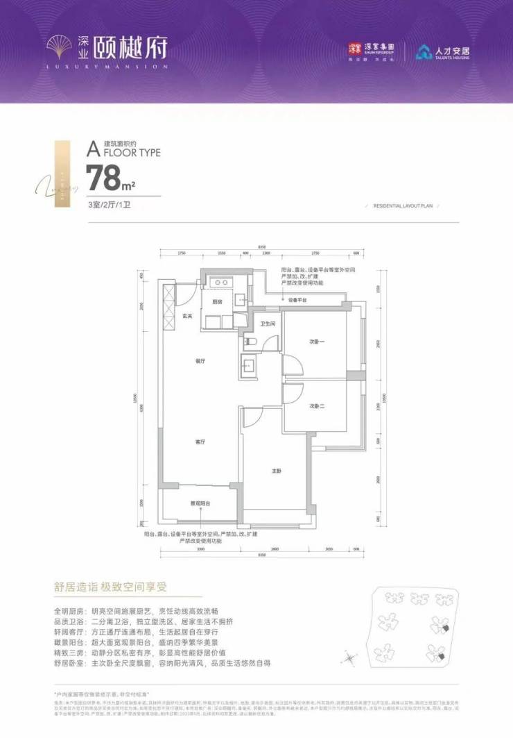 深业颐樾府约78㎡3房2厅1卫,客厅开间达到了3.3米,与市面上85㎡左右户型开间差不多。