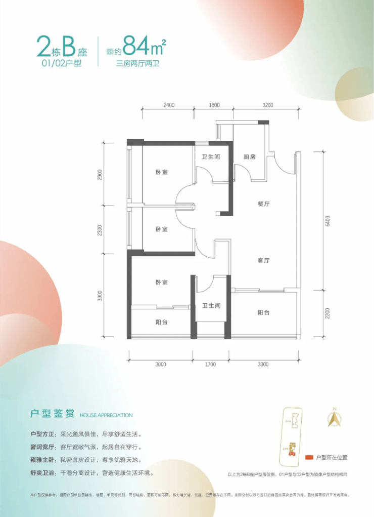 璟荟名庭2栋B座约84㎡3房2厅2卫户型,整体非常方正,其中客厅开间达到了3.3米,主卧+阳台开间最大达3.9米,尺寸相对不错。