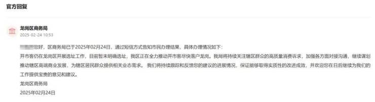 今年2月份,龙岗区商务局回应网友时表示,开市客仍在龙岗区开展选址工作,目前暂未明确选址。龙岗区正在全力推动开市客尽快落户龙岗。
