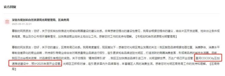 而5月份,光明规自局、商务局在领导留言板平台答复网友时也提到:星河COCOCity正加速推进建设中,预计2025年底开业运营。
