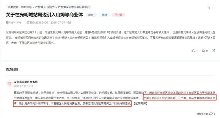 而今年7月31日,光明区商务局在答复网友关于“在光明城站周边引入山姆等商业体”的问题时,更是明确表态: