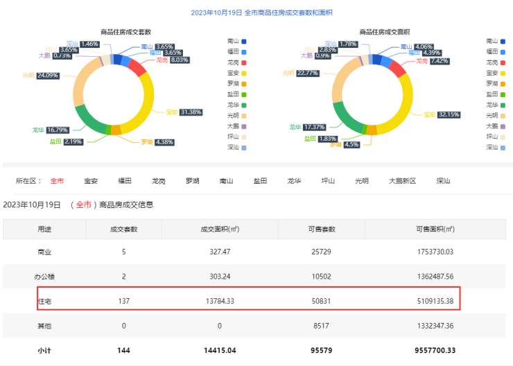 10月19日新房住宅共网签137套。宝安43套;福田5套;龙岗11套;罗湖6套;南山5套;盐田3套;龙华23套;坪山5套;光明33套;大鹏1套;深汕2套。