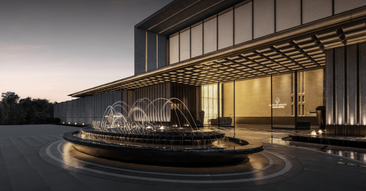 【臻品美学】对标华尔道夫酒店打造的精奢景观,一园藏四季;楼体外立面融入圣爱德华皇冠造型流线,结合钻感光幕,光华熠熠。