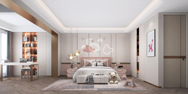 从踏入女孩房的那一刻起,脑海里便浮现了多功能的生活场景,视线和思绪都变得柔软起来。在软装配饰上选用象牙白、浪漫粉、月光灰,融入几何美学,辅以金属元素点缀,彰显女孩的柔美烂漫,让人如沐春风,闺蜜小聚、阅读闲聊,观景休憩,功能和情感之外,设计创造了额外的思考空间陪伴成长。