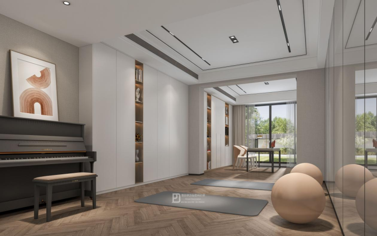 书房、琴房、健身区处于同一个空间,多功能的设计将空间利用较大化。