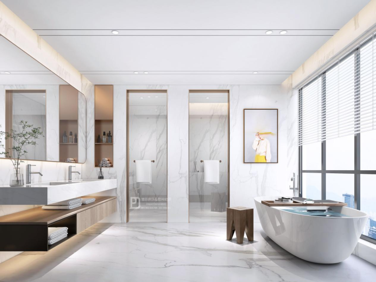 卫生间在设计上以极简风格为主线,大理石的花纹恰当好处地装饰了内部空间,巧用线条设计从视觉上拉伸空间。