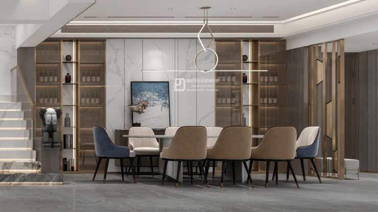 精致的生活源于对细节的执着,餐厅的设计结合了金属、皮质与大理石。简洁优雅的造型、奢华的材质拼接出一个优雅的就餐环境。