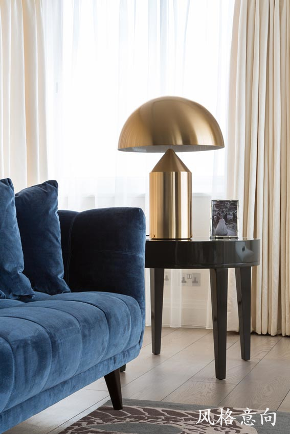灰白色沙发搭配黑色玻璃组合茶几,沉稳大气,中和空间的清冷气质,蓝色单人沙发椅点缀其中,优雅绅士,高雅又耐看。