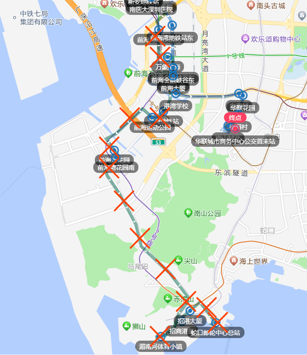 往华联城市商务中心公交首末站方向取消“梦海地铁站、前海运动公园、前海湾花园南、湄南河体育小镇”等4个单边公交停靠站。