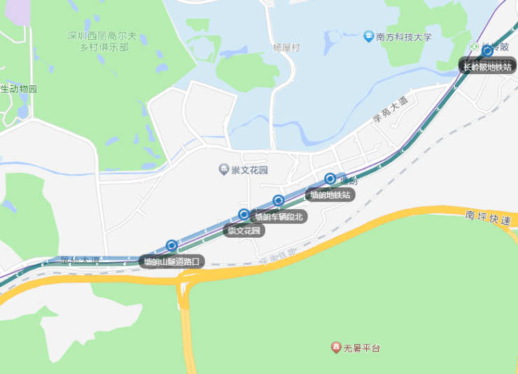 双方向增加“塘朗山隧道路口、塘朗车辆段北、塘朗地铁站”等3对公交停靠站。