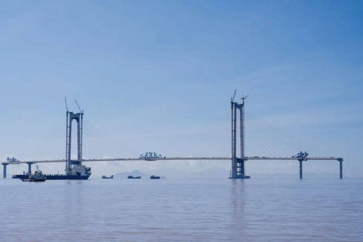 中山大桥是项目关键控制性工程之一,为主跨580米的双塔斜拉桥,主塔高213.5米,由120根斜拉索连接主塔与桥面,如“竖琴”跃于海面。