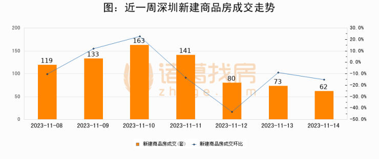 根据深圳市住房和城乡建设局数据显示,2023年11月14日深圳新建商品房成交62套,较昨日减少11套,环比下降15.1%