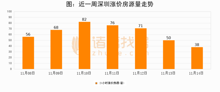 根据诸葛找房数据显示,深圳24小时涨价房源量为38套,较11月13日减少12套,环比下降24%。与此同时,涨价房源占比小幅回落,对于购房者来说是一个入市窗口期,购房者可抓住时机入市。