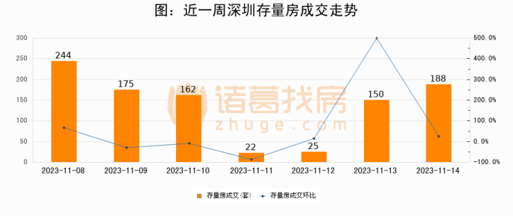 从存量房来看,2023年11月14日深圳存量房单日成交188套,比昨日增加38套,环比上涨25.3%。从近一周存量房成交来看,深圳存量房日均成交套数为138套,11月14日单日成交188套,高于近一周平均水平36.2%。