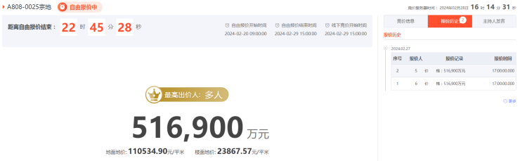 截止到2月28日下午16时,仅有2家房企参与报价,两家房企的报价均是起始价51.69亿。