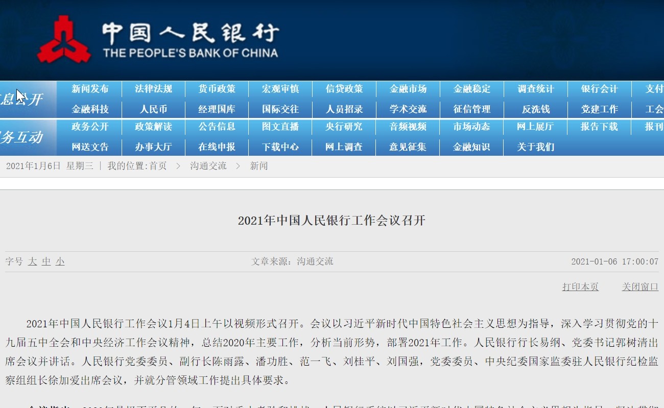 2021年中国人民银行工作会议1月4日上午以视频形式召开。会议以习近平新时代中国特色社会主义思想为指导,深入学习贯彻党的十九届五中全会和中央经济工作会议精神,总结2020年主要工作,分析当前形势,部署2021年工作。人民银行行长易纲、党委书记郭树清出席会议并讲话。人民银行党委委员、副行长陈雨露、潘功胜、范一飞、刘桂平、刘国强,党委委员、中央纪委国家监委驻人民银行纪检监察组组长徐加爱出席会议,并就分管领域工作提出具体要求。