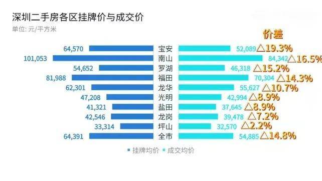 深圳贝壳研究院统计,今年上半年(1月1日-6月24日)深圳二手房挂牌价与成交价的价差达到了14.8%,其中东部及北部等非限购区域价差相对较低,核心区域的价差相对较高,价差最大的是宝安片区。