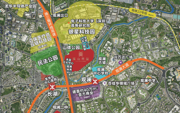 项目规模较大,整体东南向沿观澜河布局,与观澜古墟历史文化街区一河之隔;西南向毗邻梅观大道及深圳民法公园;北向背靠山体公园,与银星科技园、迈瑞医疗龙华基地(建设中)等重磅产业园相近。