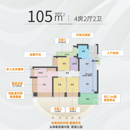 本批次产品中最大面积户型,位于1栋,东南朝向最前排,一共两条腿。观景阳台约2.1米宽,加上三个卧室一共四开间推窗即是观澜河、碧道公园、大布巷历史文化公园景观,视野开阔无遮挡,居住感受好。