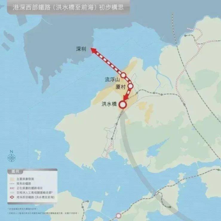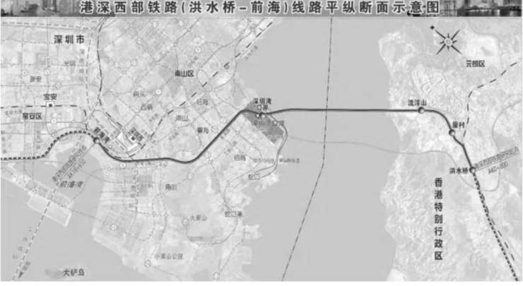 据公开消息,计划兴建的港深西部铁路,将会由洪水桥至前海,全长约18公里,由港铁屯马线洪水桥站附近位置出发,途经厦村和流浮山,跨越后海湾经深圳湾口岸接入前海,配合内地交通网络。