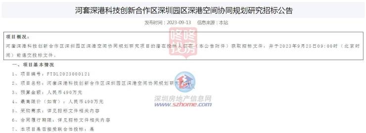 9月13日,福田区正式启动河套深港科技创新合作区深圳园区深港空间协同规划研究项目招标,预算金额为人民币490万元。