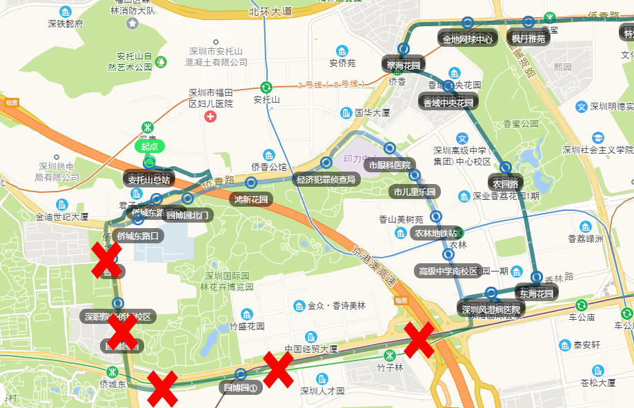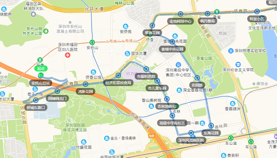 双方向增加“园博园北门、鸿新花园、市眼科医院、市儿童乐园、农林地铁站、高级中学南校区”等6对公交停靠站,取消“警校、深职院华侨城校区、园博园西、园博园”等4对公交停靠站。