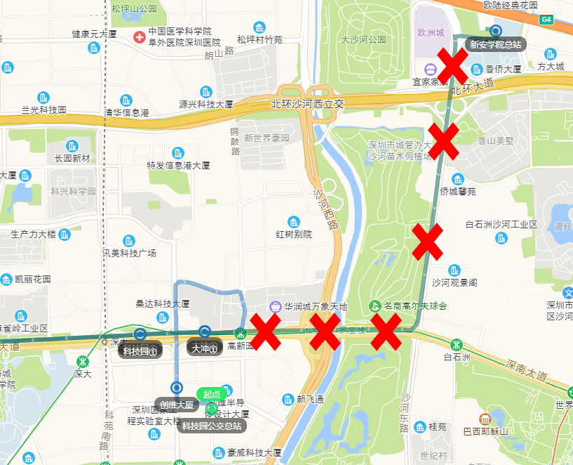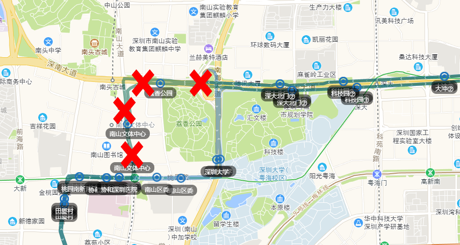 取消“南山文体中心”1对公交停靠站和“荔香公园(南侧)”1个单边公交停靠站,增加“南山区委、深圳大学”等2对公交停靠站。