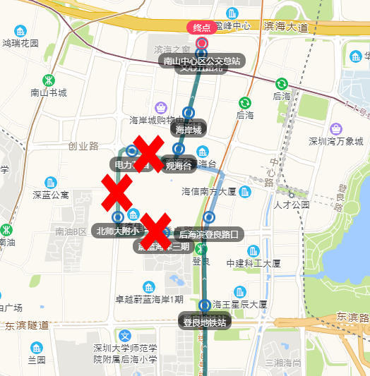 双方向取消“电力花园、北师大附小、蔚蓝海岸三期”等3对公交停靠站,增加“后海滨登良路口”1对公交停靠站。
