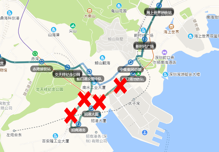 往月亮湾公交综合车场方向取消“蛇口港地铁站”1个单边公交停靠站,增加“中集集团总部、蛇口港交警中队、赤湾接驳站”等3个单边公交停靠站。