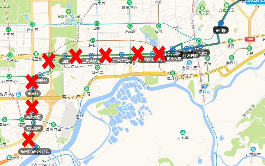 一端总站由福田口岸公交总站调整为东昌总站,线路调整为东昌总站-地王大厦-东昌总站(单环线)。