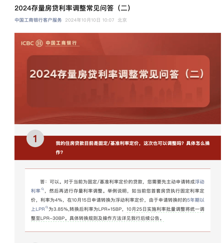 10月10日,中国银行、工商银行、招商银行、民生银行等多家银行发布《2024年存量房贷利率调整客户问答》,明确了存量房贷利率下调的诸多细则。