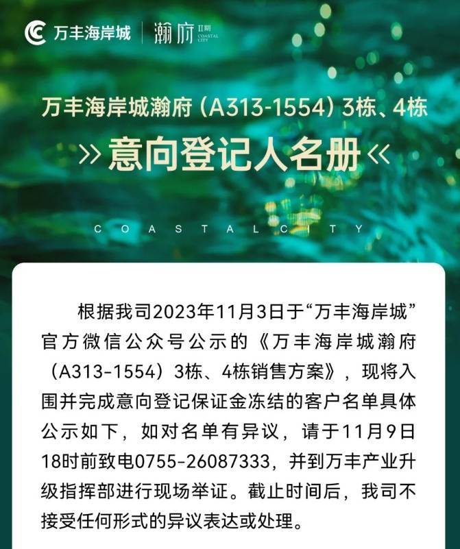 11月9日,万丰海岸城瀚府(A313-1554)3栋、4栋意向登记人名册公示,共有263批客成功意向登记,项目将于11月10日上午进行选房顺序号摇号。
